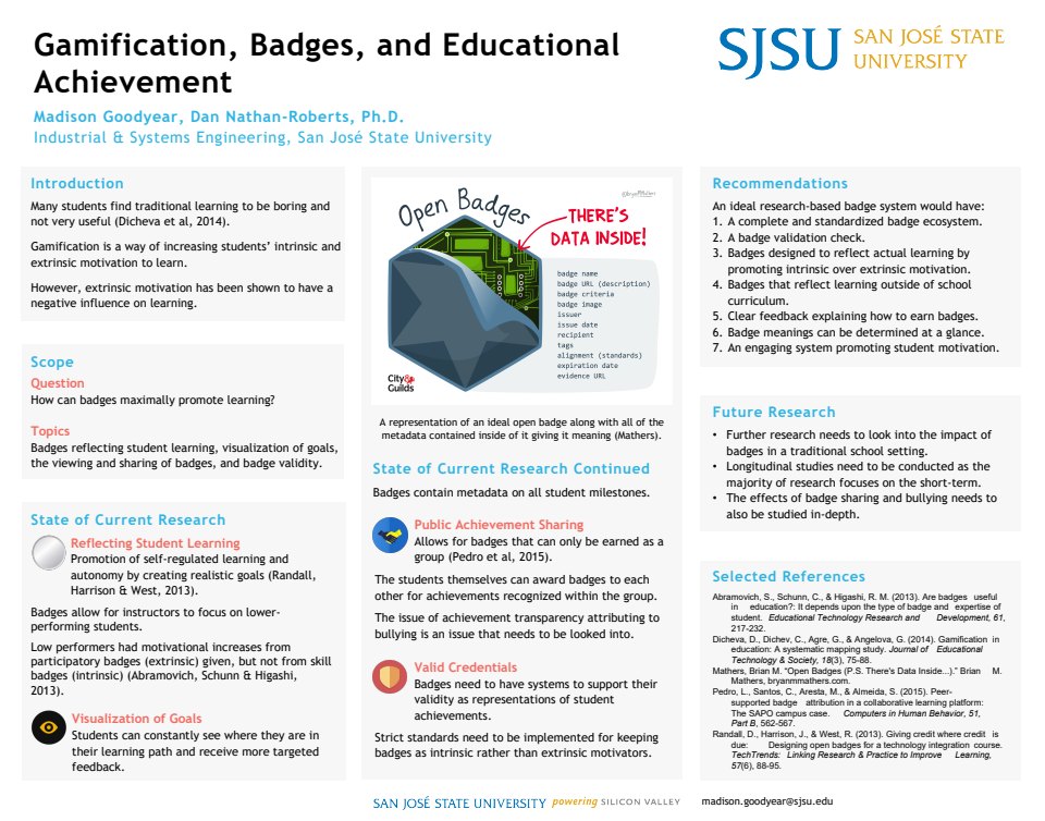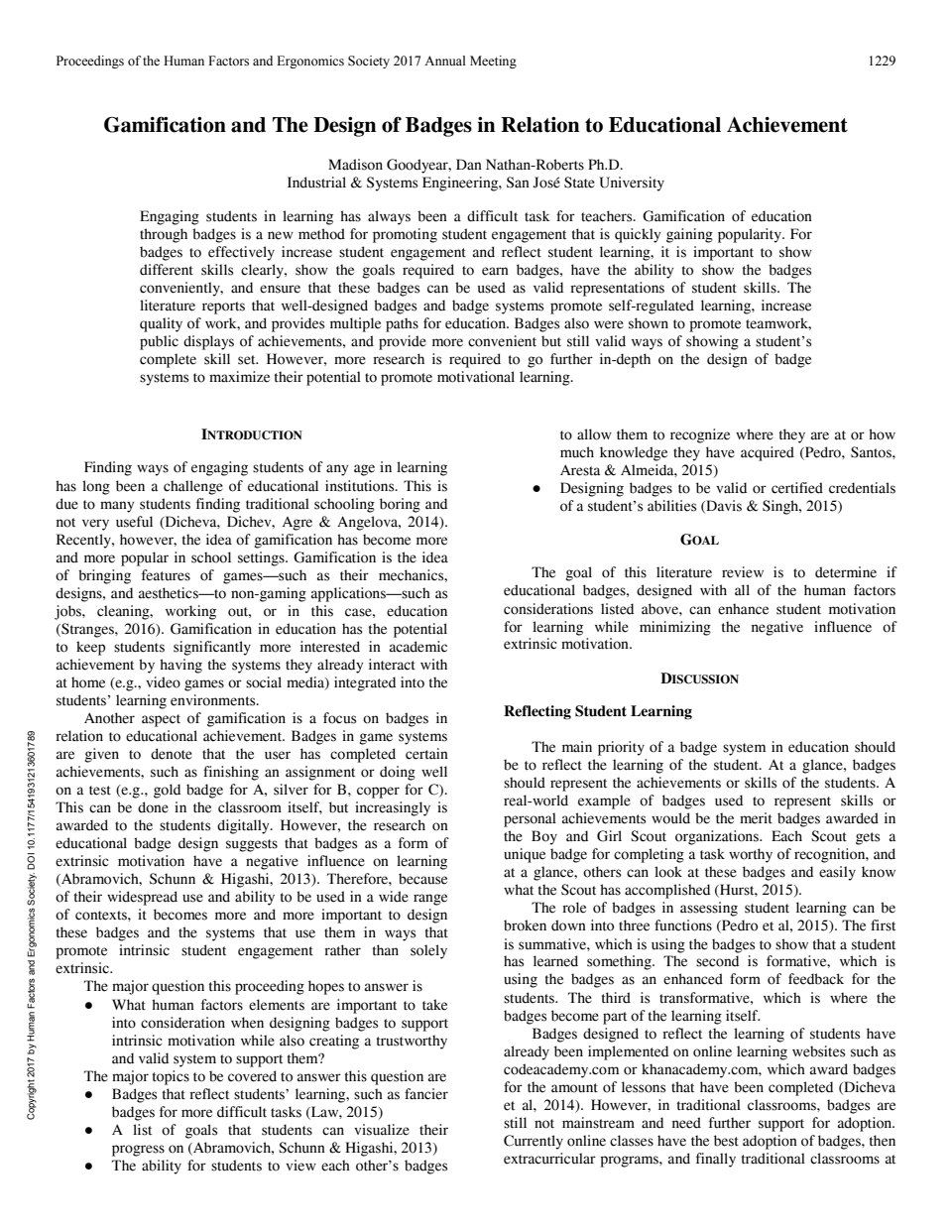 Goodyear, M. & Nathan-Roberts, D. Gamification and The Design of Badges in Relation to Educational Achievement. Proceedings of the Human Factors and Ergonomics Society Annual Meeting, 2017, 61, 1229-1233.